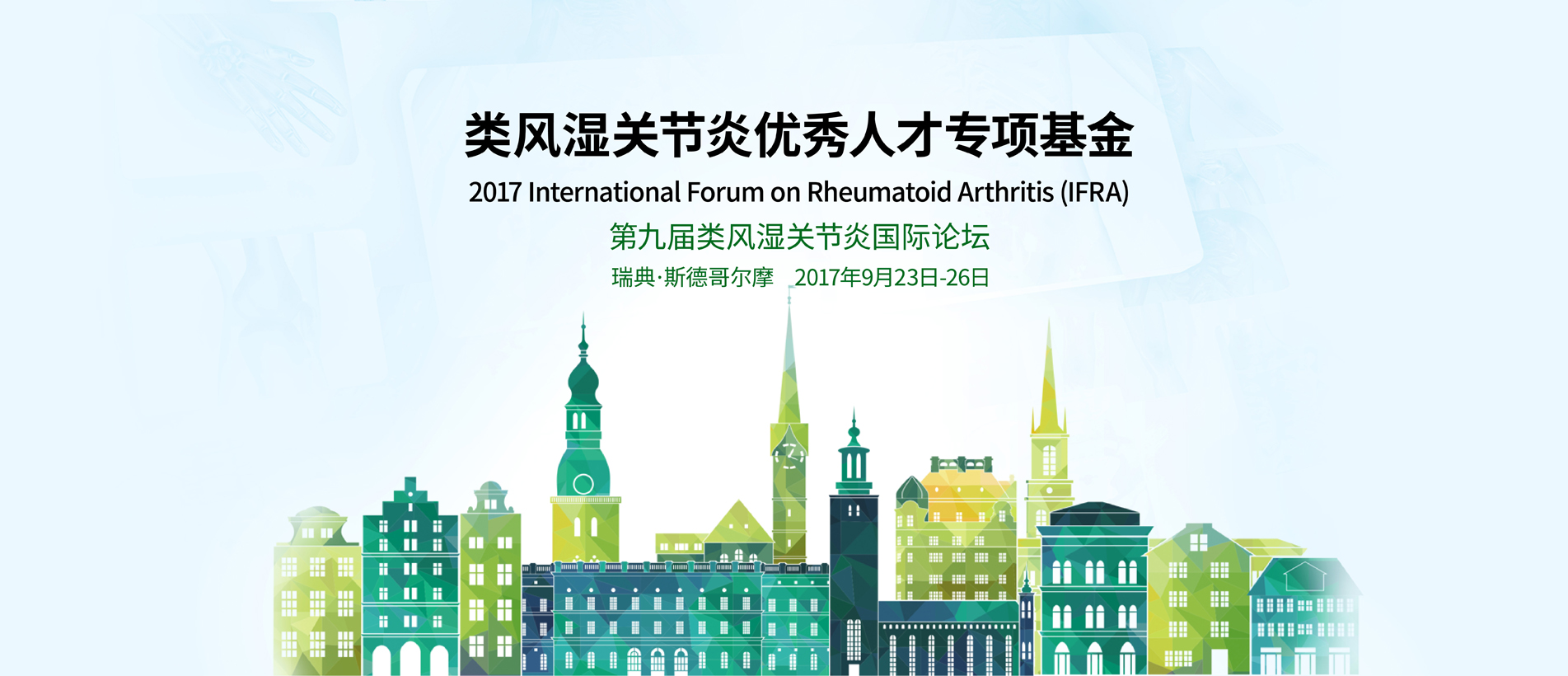 第九屆類風濕關節炎國際論壇(IFRA)將于2017年9月23日-26日在瑞典斯德哥爾摩舉行,屆時將有來自亞洲、美國、歐洲等地的國際一流專家共聚一堂,對類風濕關節炎的相關基礎與臨床進行最前沿的學術報告和研討。