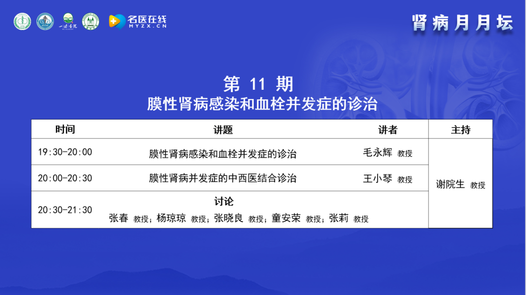 眾所周知,腎臟病患病率很高,特別是膜性腎病,在腎病綜合征的腎活檢比率中占據(jù)首位。膜性腎病的無(wú)創(chuàng)診斷和治療手段日新月異,而且膜性腎病的異質(zhì)性很大。基于此背景,“腎病月月壇”自2022年5月17日開(kāi)始舉辦,在每個(gè)月的第三周的星期二晚上,每月一期,每期一個(gè)主題,已經(jīng)舉辦了十期,包括”激素和免疫抑制劑在膜性腎病的合理應(yīng)用”、“利妥昔單抗在膜性腎病的合理應(yīng)用”、“原發(fā)性和繼發(fā)性膜性腎病的鑒別”、“中醫(yī)對(duì)膜性腎病的認(rèn)識(shí)”、“膜性腎病的抗原分類(lèi)及發(fā)病機(jī)制”、“膜性腎病的臨床表現(xiàn)、無(wú)創(chuàng)診斷和病理診斷”、“膜性腎病的自發(fā)緩解和非免疫抑制治療”、“非典型膜性腎病的病理表現(xiàn)及鑒別診斷思路”、“膜性腎病與腫瘤”、“膜性腎病的流行病學(xué)與研究歷程”。本期是該論壇的第11期,主題是“膜性腎病感染和血栓并發(fā)癥的診治”。在膜性腎病的發(fā)展和治療過(guò)程中,常常遇到感染并發(fā)癥和血栓并發(fā)癥,經(jīng)常會(huì)影響膜性腎病的轉(zhuǎn)歸和預(yù)后,有時(shí)治療的很好突然感染又復(fù)發(fā)了,有時(shí)治療的很困難可能是感染沒(méi)有控制或血栓的形成,針對(duì)這些問(wèn)題,本期專(zhuān)門(mén)邀請(qǐng)的講者和討論嘉賓都是業(yè)內(nèi)非常著名的臨床專(zhuān)家、博士生導(dǎo)師、腎內(nèi)科主任、業(yè)內(nèi)大咖,具有豐富的臨床、教學(xué)和科研經(jīng)驗(yàn),相信他們的分享一定會(huì)對(duì)大家的臨床診療有所幫助。