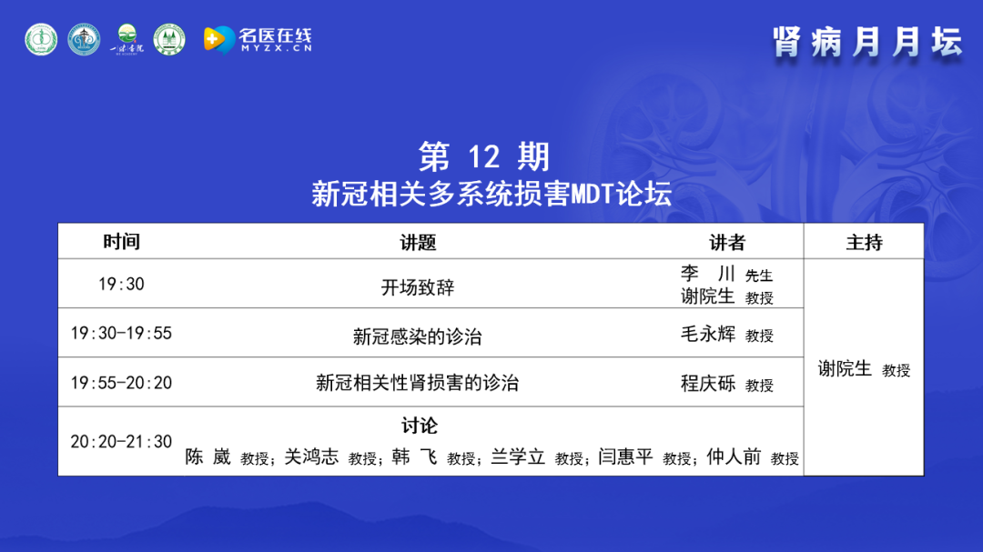 2023年4月11日,由北京中西醫(yī)結(jié)合學(xué)會(huì)腎臟病專業(yè)委員會(huì)舉辦的《腎病月月壇(第12期)——新冠相關(guān)多系統(tǒng)損害MDT論壇》于線上成功舉辦。本次論壇由北京中西醫(yī)結(jié)合學(xué)會(huì)腎臟病專業(yè)委員會(huì)主任委員、解放軍總醫(yī)院第一醫(yī)學(xué)中心謝院生教授擔(dān)任大會(huì)主席,歐蒙醫(yī)學(xué)診斷CEO,一味書(shū)院執(zhí)行院長(zhǎng)、發(fā)起人李川先生作為致辭嘉賓,北京醫(yī)院毛永輝教授、解放軍總醫(yī)院第二醫(yī)學(xué)中心程慶礫教授作為講課嘉賓,中山大學(xué)附屬第一醫(yī)院陳崴教授、北京協(xié)和醫(yī)院關(guān)鴻志教授、浙江大學(xué)醫(yī)學(xué)院第一附屬醫(yī)院韓飛教授、北京大學(xué)航天臨床醫(yī)學(xué)院蘭學(xué)立教授、首都醫(yī)科大學(xué)附屬北京佑安醫(yī)院閆惠平教授以及上海長(zhǎng)征醫(yī)院仲人前教授作為本次大會(huì)的討論嘉賓。