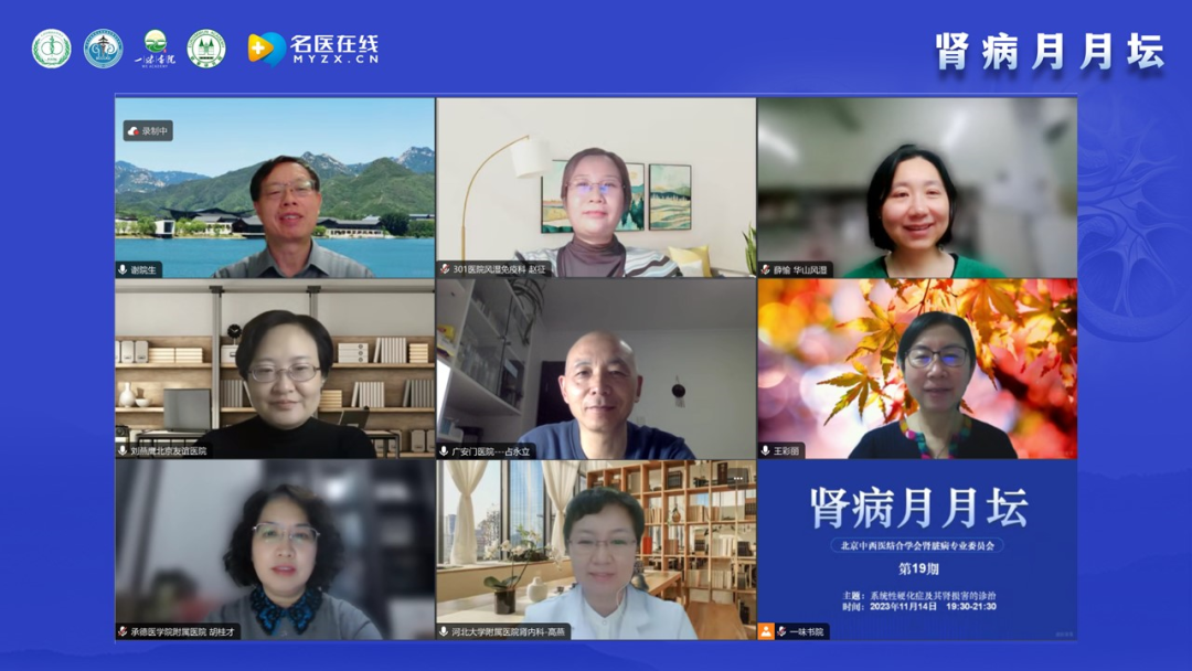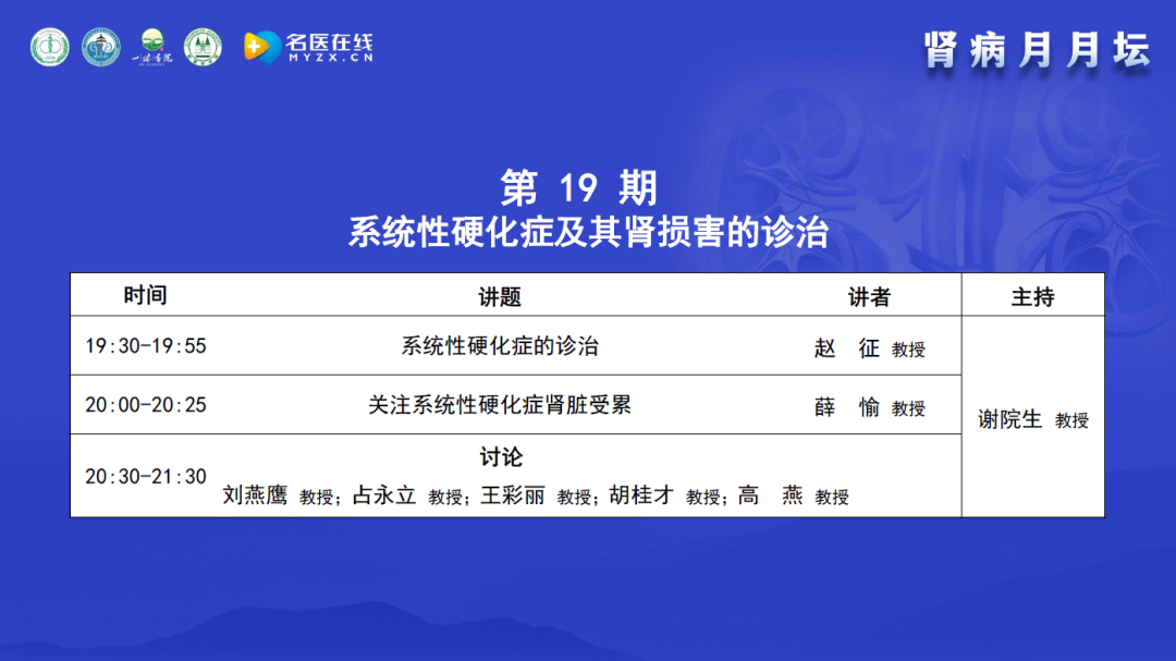 謝教授介紹腎病月月壇自2022年5月線上舉辦后受到全國同仁的支持和歡迎。學(xué)術(shù)活動(dòng)開始主要聚焦于膜性腎病,后逐漸擴(kuò)展到新冠相關(guān)性多學(xué)科論壇及風(fēng)濕病相關(guān)腎損害。在論壇內(nèi)容上,以臨床需求和臨床問題為導(dǎo)向,體現(xiàn)中醫(yī)和西醫(yī)的結(jié)合、腎科和其他學(xué)科的結(jié)合;在形式上,體現(xiàn)以講座、病例分享和點(diǎn)評討論相結(jié)合。本期討論和學(xué)術(shù)交流的主要內(nèi)容是系統(tǒng)性硬化癥及其腎損害的診治,邀請的講者和討論嘉賓都是風(fēng)濕科和腎內(nèi)科在系統(tǒng)性硬化癥領(lǐng)域很有經(jīng)驗(yàn)的專家,相信能為大家?guī)碛袃r(jià)值的內(nèi)容。