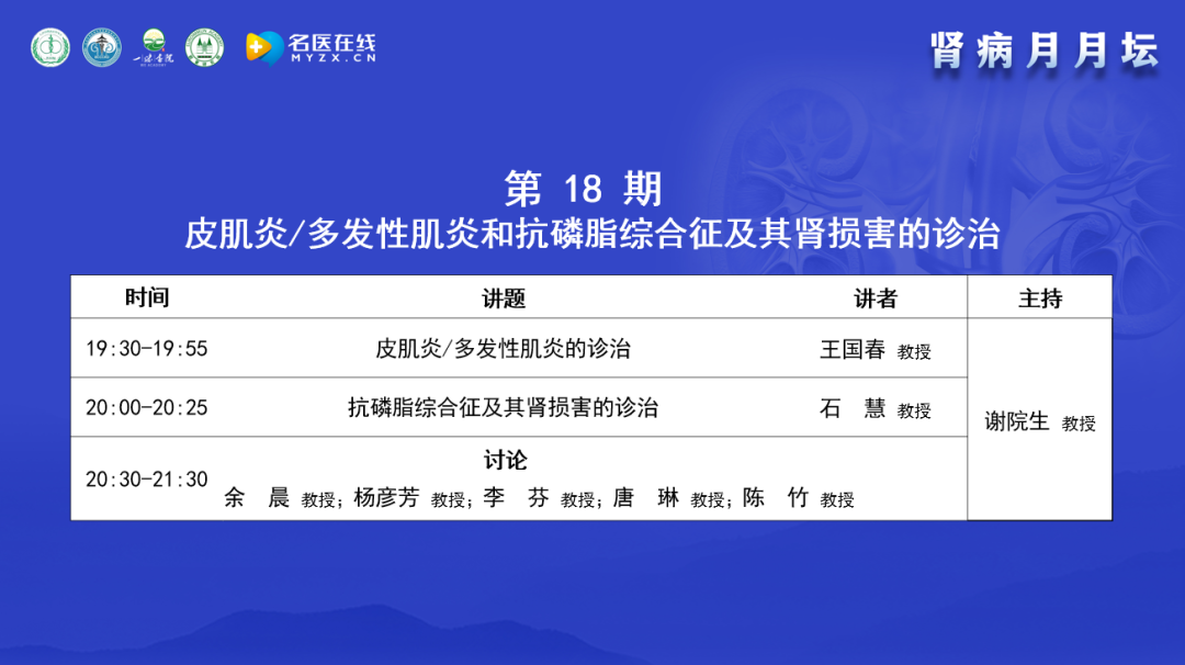 謝教授介紹腎病月月壇自2022年5月線上舉辦后受到全國同仁的支持和歡迎。學(xué)術(shù)活動開始主要聚焦于腎臟疾病,以膜性腎病為主,后逐漸擴展到新冠相關(guān)性多學(xué)科論壇及風(fēng)濕病相關(guān)腎損害。在論壇內(nèi)容上,以臨床需求和臨床問題為導(dǎo)向,體現(xiàn)中醫(yī)和西醫(yī)的結(jié)合、腎科和其他學(xué)科的結(jié)合;在形式上,體現(xiàn)以講座、病例分享和點評討論相結(jié)合。本期討論和學(xué)術(shù)交流的主要內(nèi)容是皮肌炎、多發(fā)性肌炎和抗磷脂綜合征及其腎損害。皮肌炎、多發(fā)性肌炎和抗磷脂綜合征腎損害在臨床上常見,影響著患者的生活質(zhì)量和生命質(zhì)量。論壇內(nèi)容同樣包括講座和點評討論,針對皮肌炎、多發(fā)性肌炎和抗磷脂綜合征及其腎損害的問題展開交流和討論。本期邀請的講者和點評、討論嘉賓都是風(fēng)濕科和腎內(nèi)科非常著名的專家,具有豐富的臨床、教學(xué)和科研經(jīng)驗。