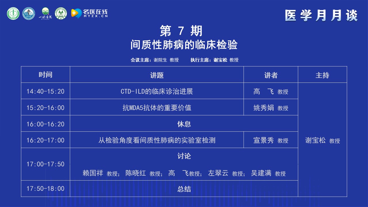 謝教授簡單介紹了“醫學月月談”的前身“腎病月月壇”的歷史,“腎病月月壇”是在疫情防控期間開展的線上學術交流活動,以腎臟病或系統性疾病腎損害的診治為主,每期一個主題,形式和內容都很受歡迎。為了讓更多的人受益,升級為“醫學月月談”?!搬t學月月談”是一個以臨床需求為導向,以解決臨床問題為目的,線下和線上相結合的醫學交流活動。本期醫學月月談的主題是間質性肺病的臨床檢驗,非常榮幸的邀請到在間質性肺病領域非常著名的謝寶松教授作為本期的執行主席,相信本期月月談將在謝教授的引導下,在各位專家們的大力支持下,取得圓滿成功。